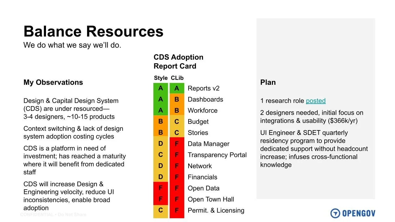 At OpenGov, my mission was to prepare the design team for aggressive growth ahead of a potential IPO—improving morale, building scalable foundations, and elevating design quality across an expanding product suite.